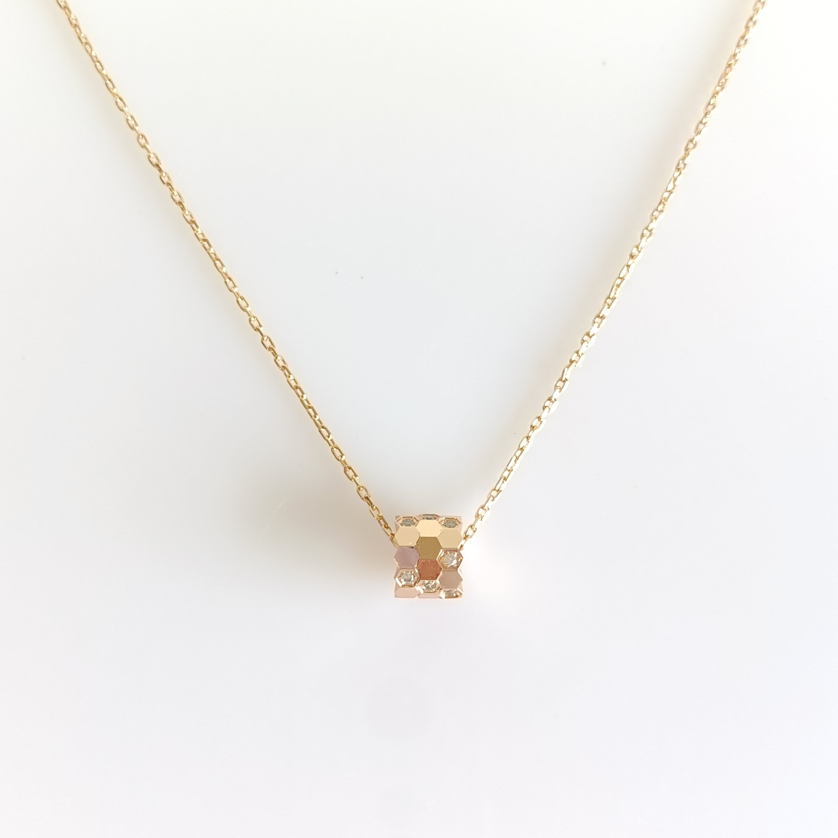 ミツバチの巣のように、連なるハニカムモチーフが無限に続く、グラフィックでモダンなデザイン。光を取り込み、身につける人と共に輝きます。