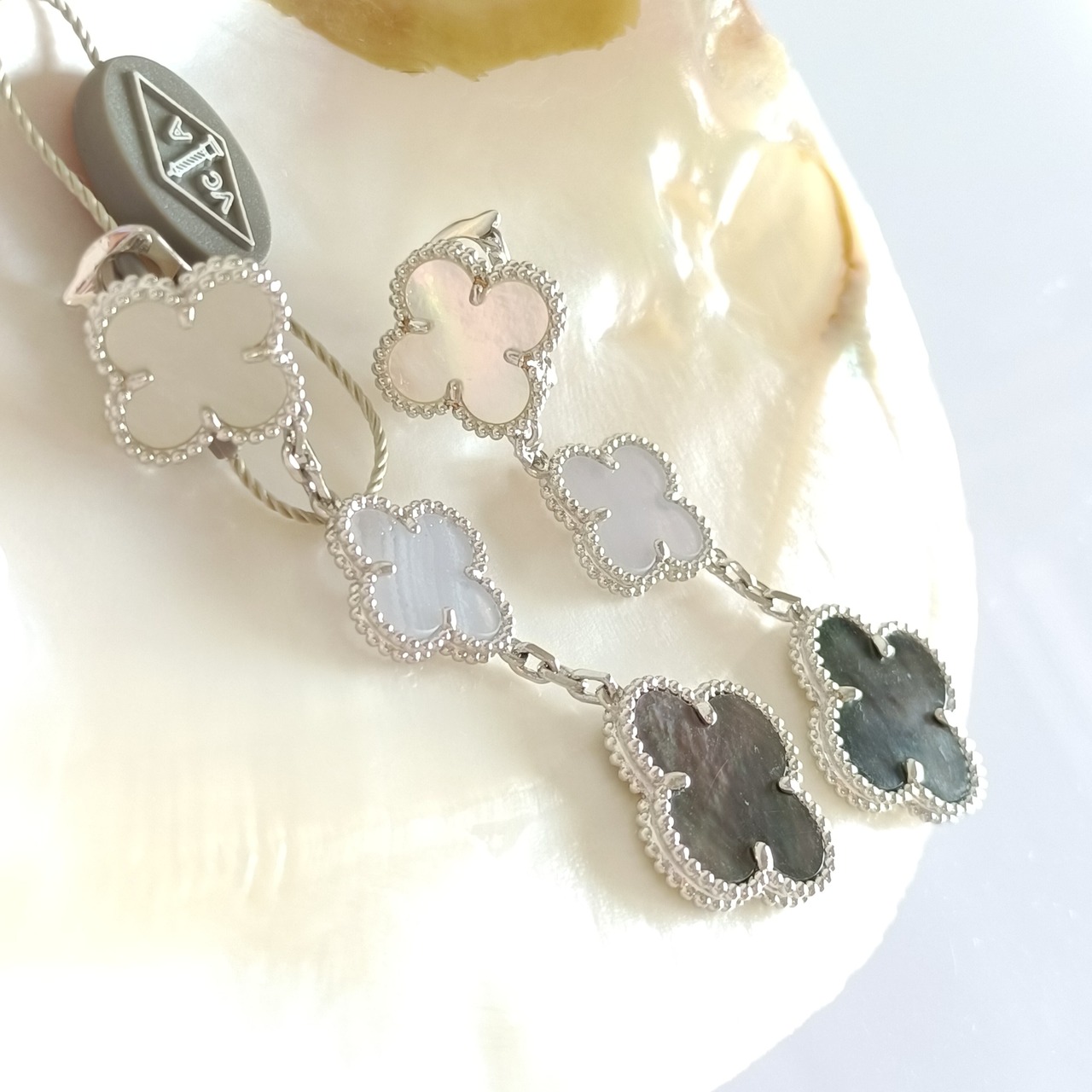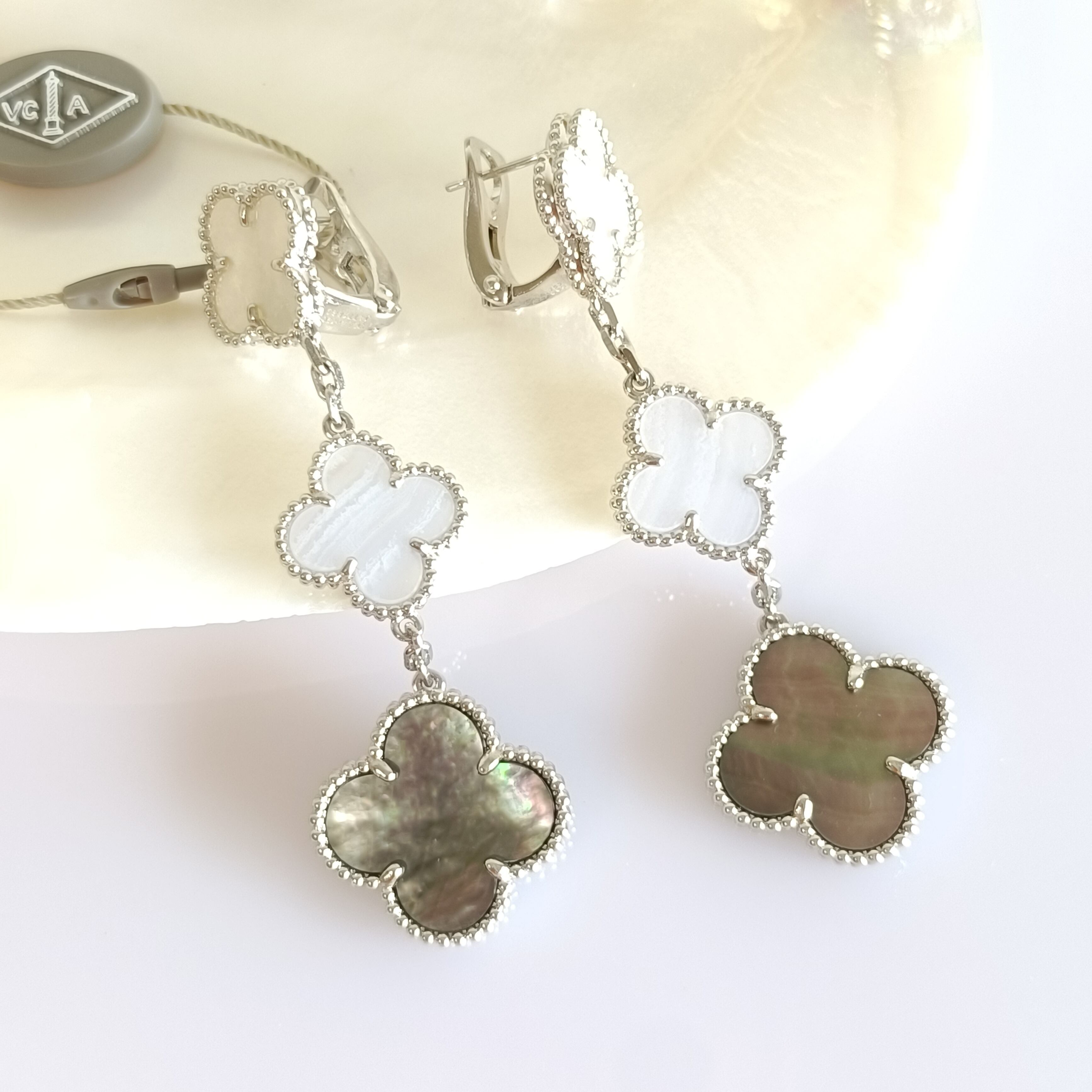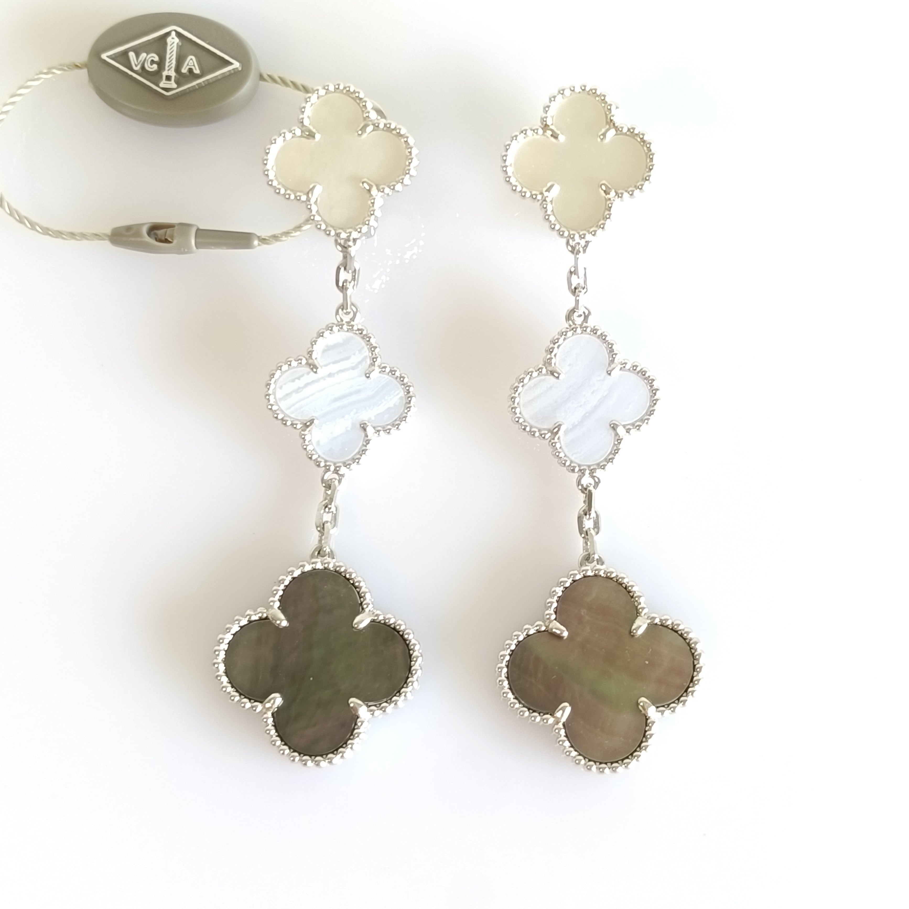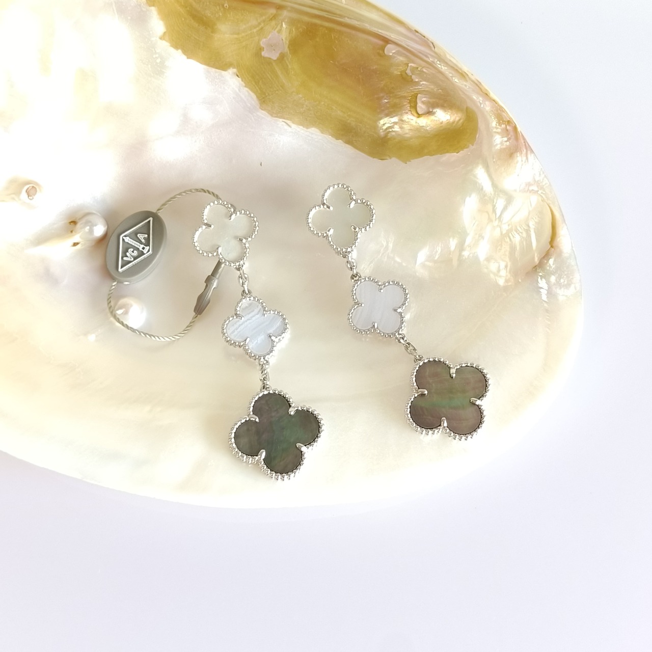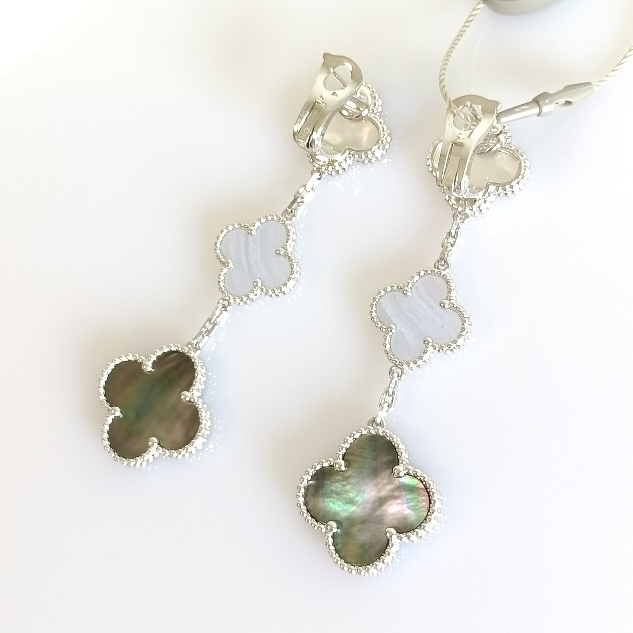 白蝶貝 カルセドニー 黒蝶貝 ホワイトゴールド 3pクローバーピアス