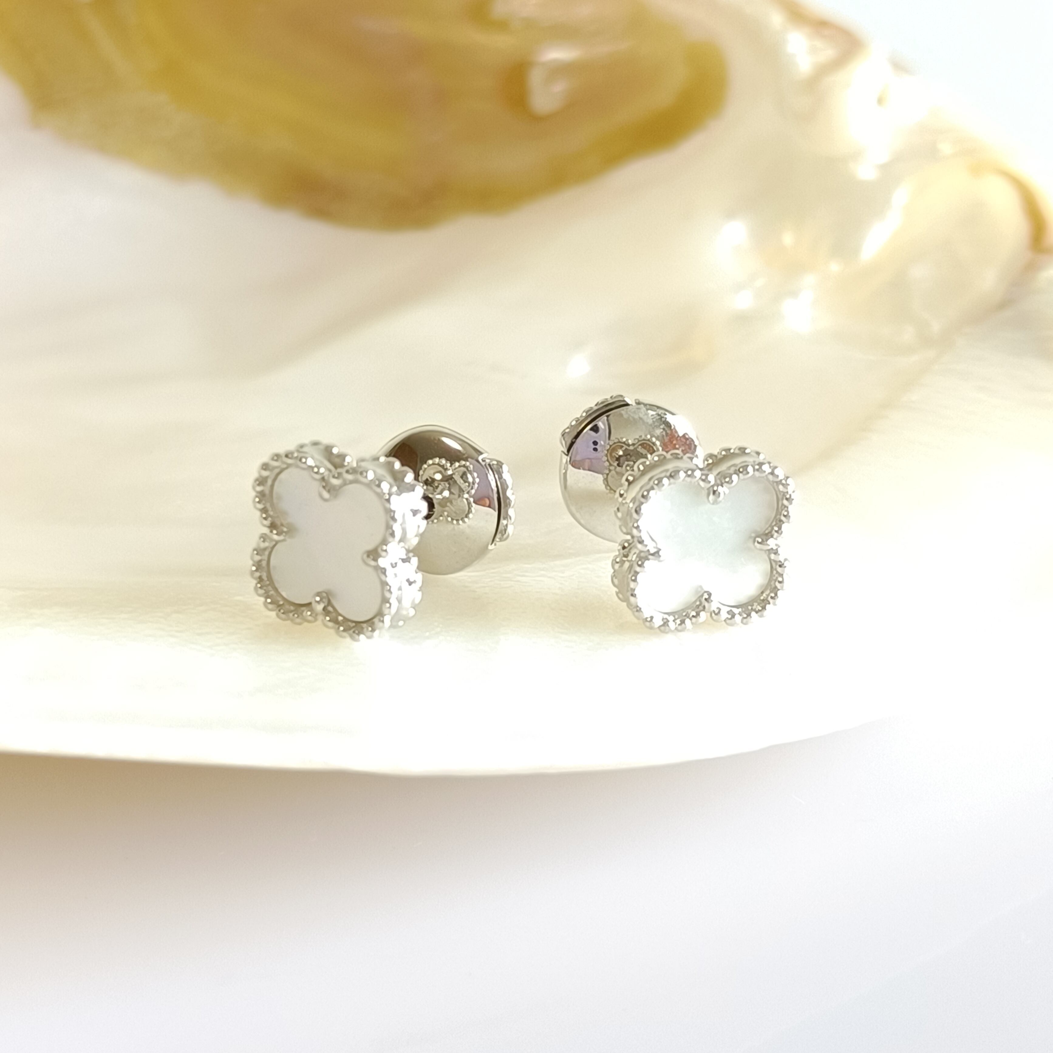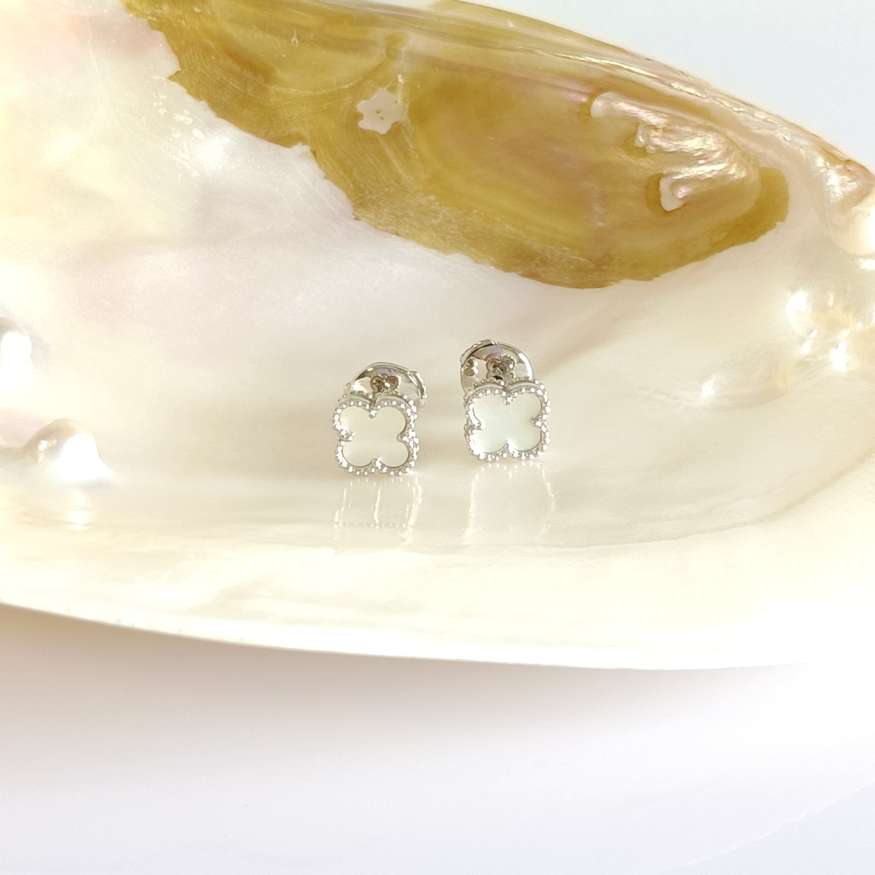 白蝶貝 ホワイトゴールド ミニクローバーピアス 9.5mm