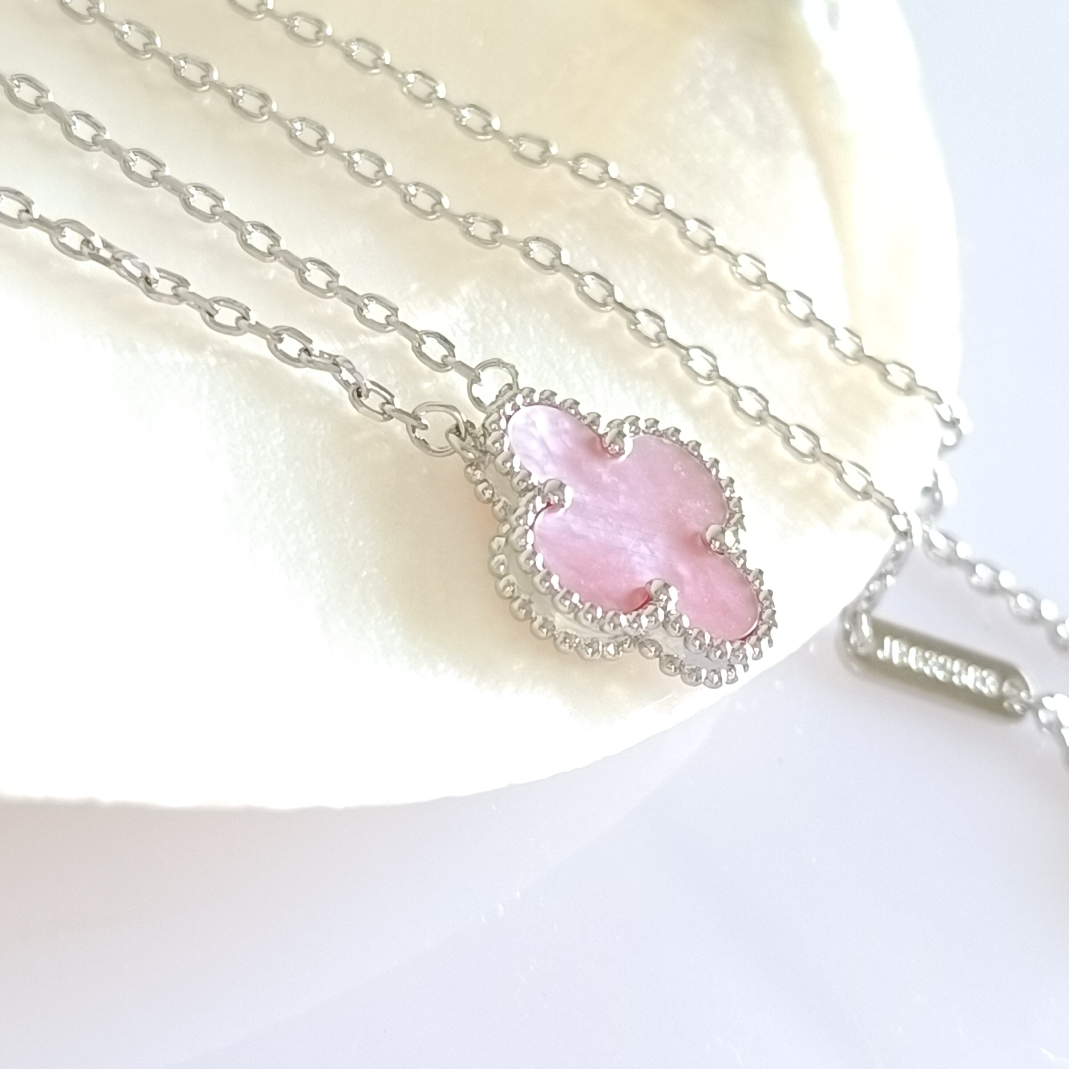 ピンク蝶貝 ホワイトゴールド クローバーネックレス 15mm