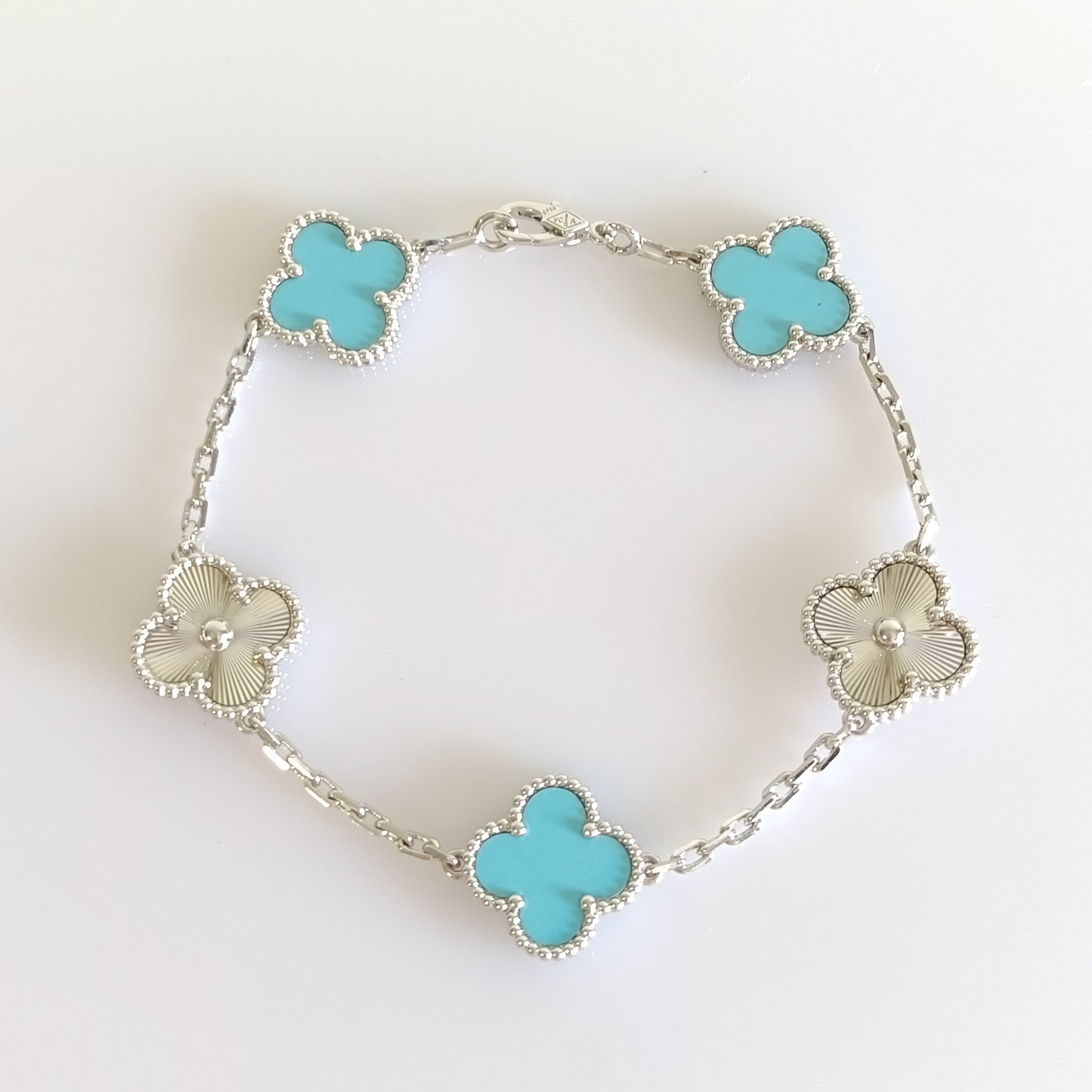 ターコイズ ギヨシェ ホワイトゴールド クローバーブレスレット