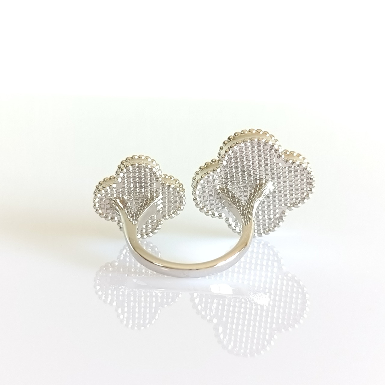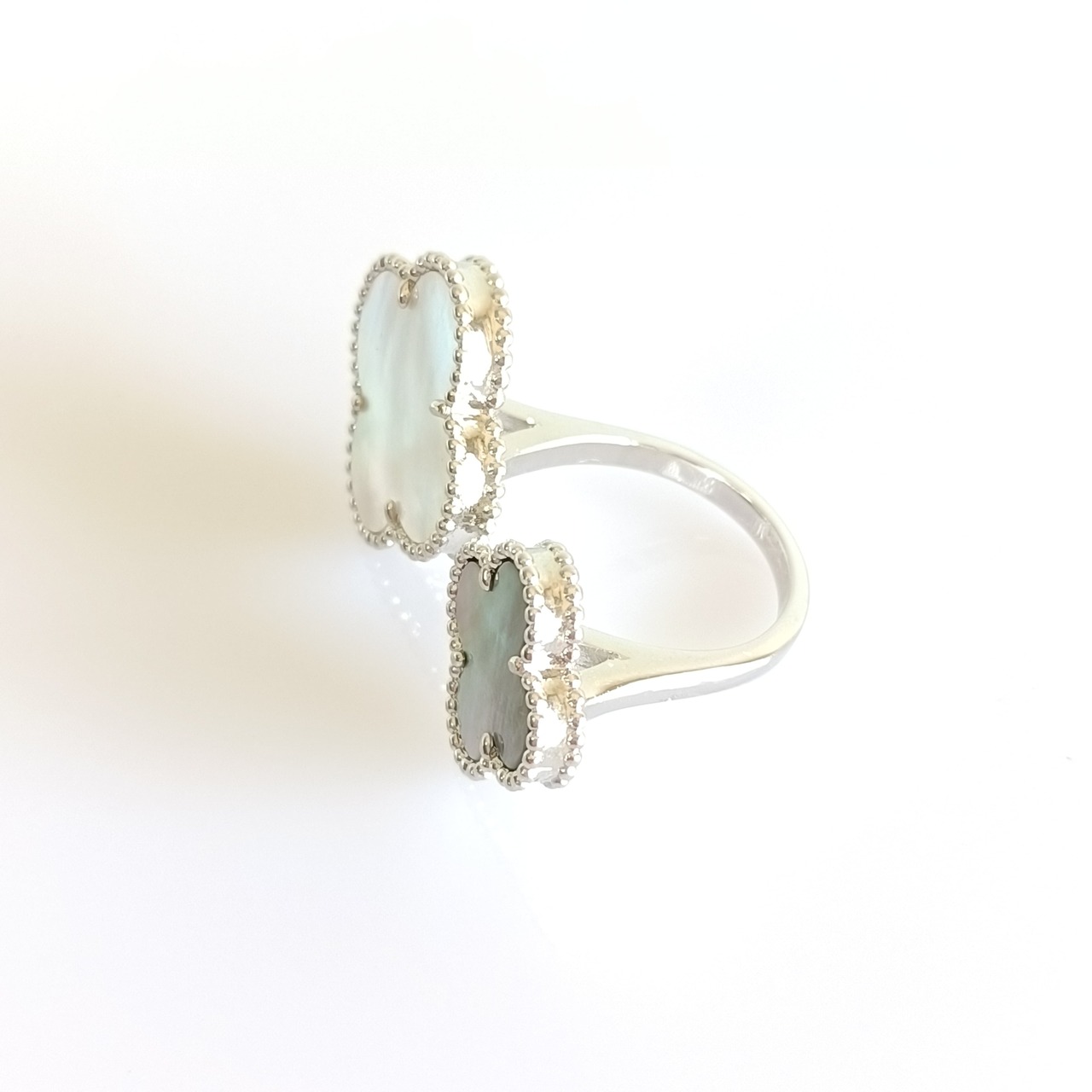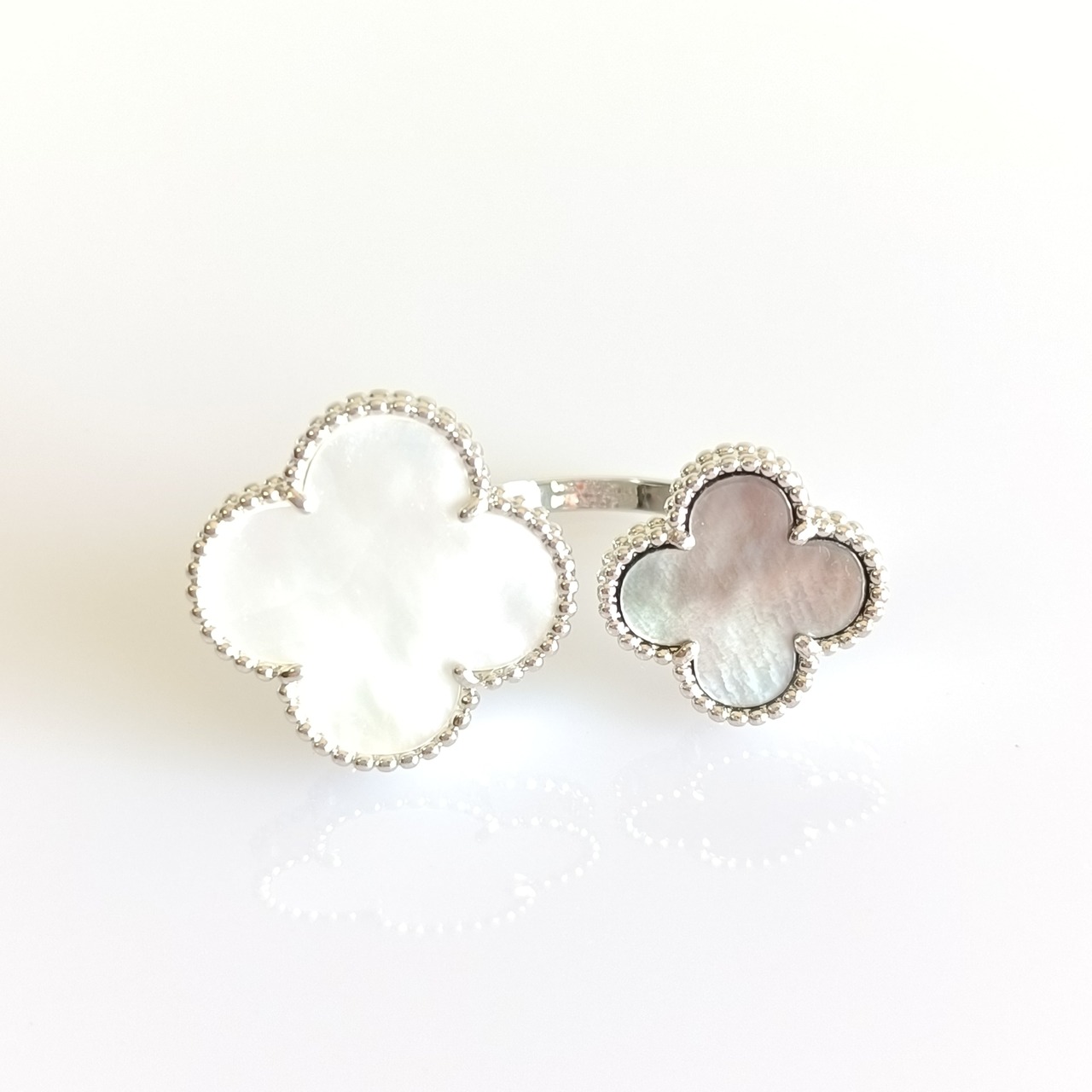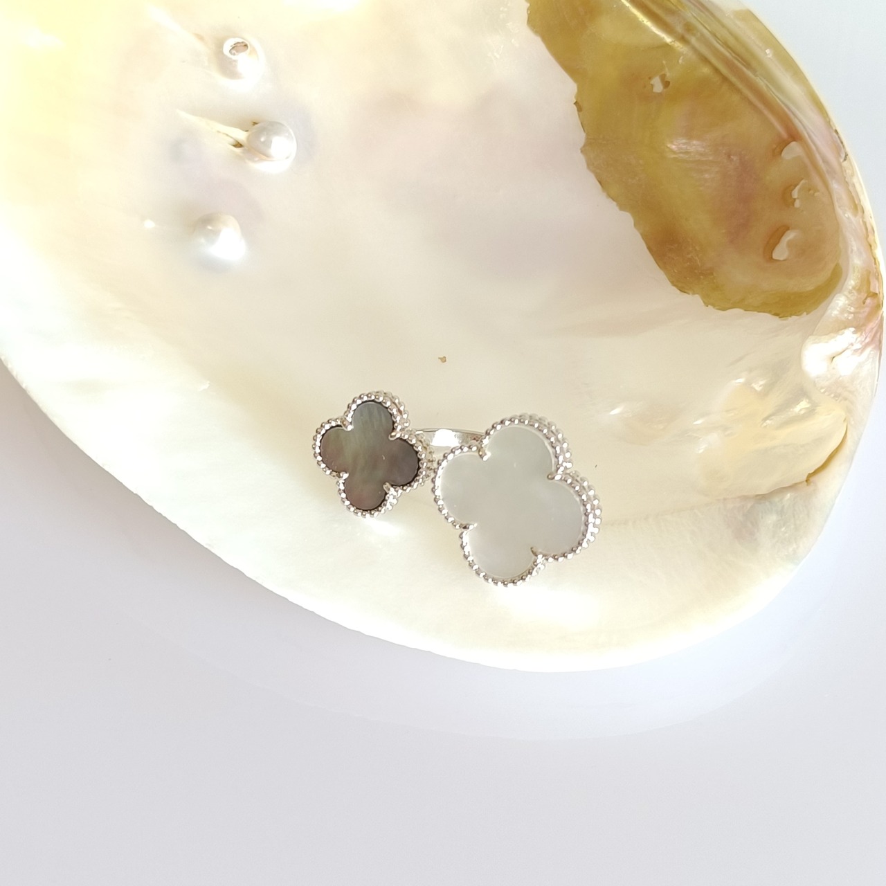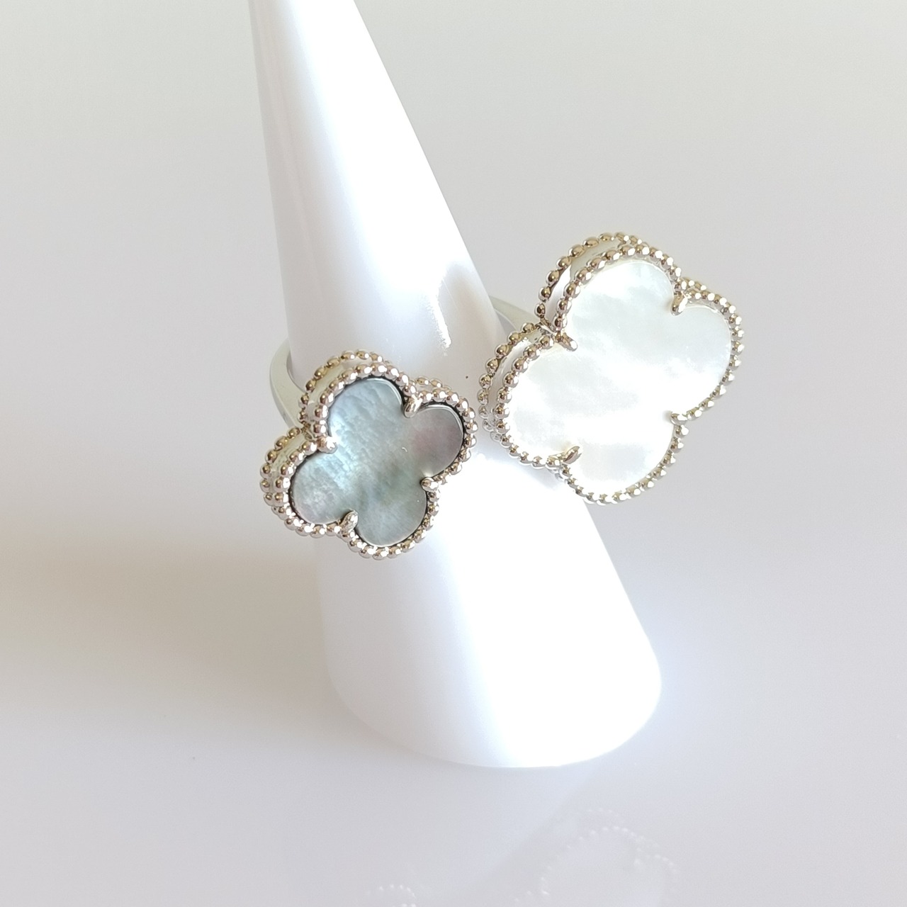 白蝶貝 黒蝶貝ホワイトゴールド クローバーオープンリング フリーサイズ