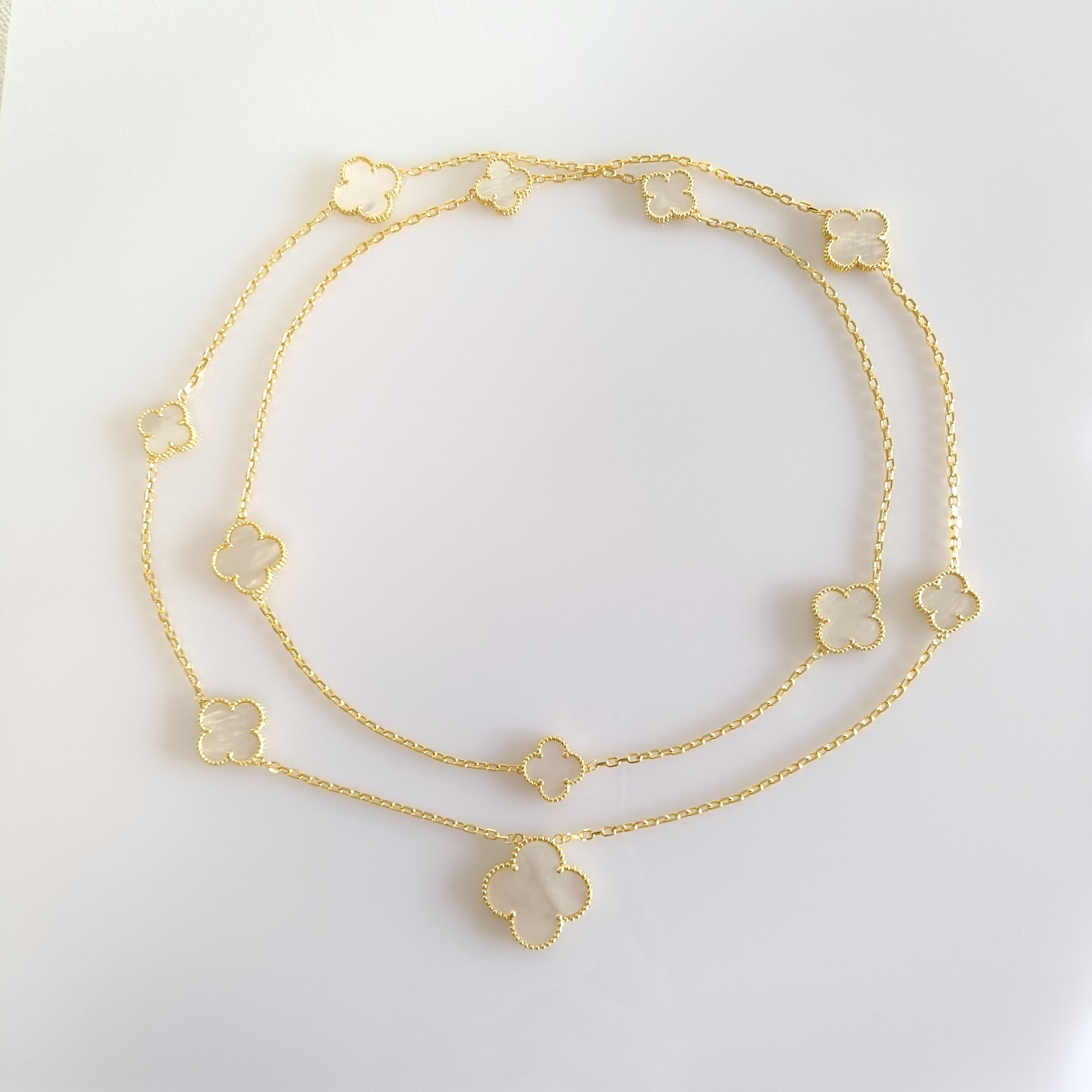 11p 白蝶貝 イエローゴールド クローバーロングネックレス